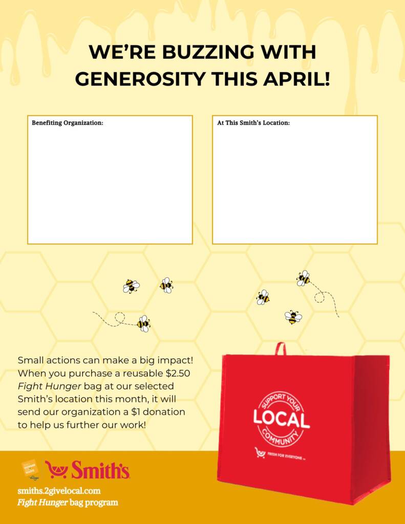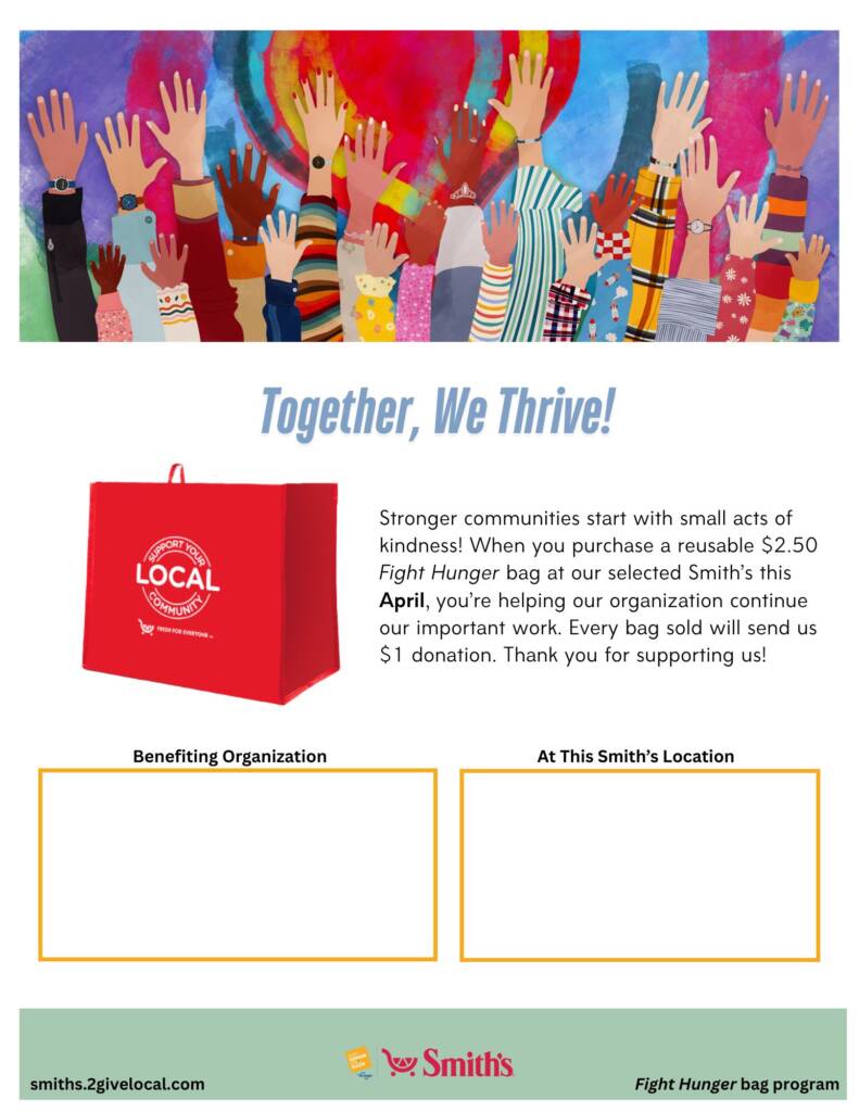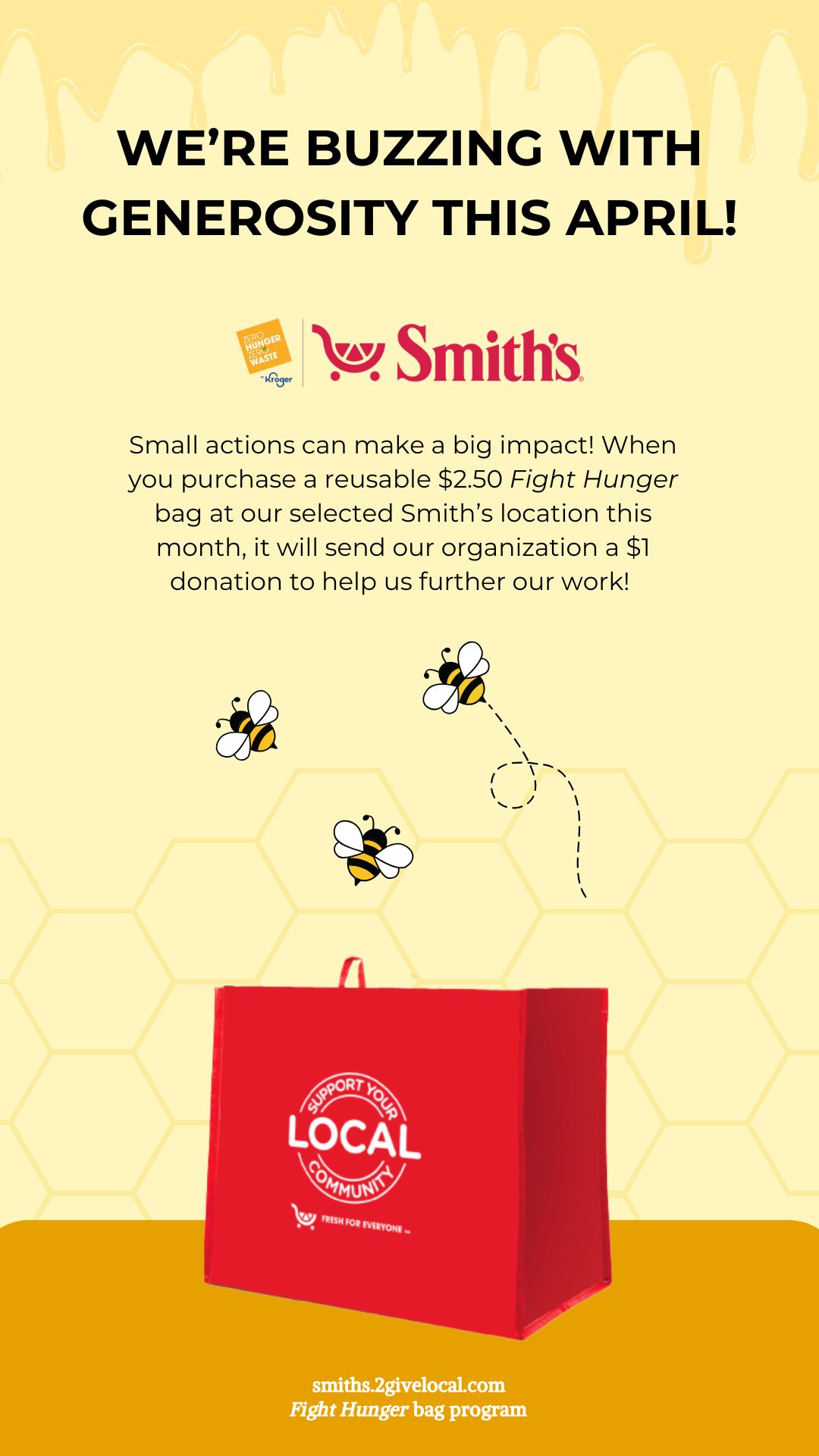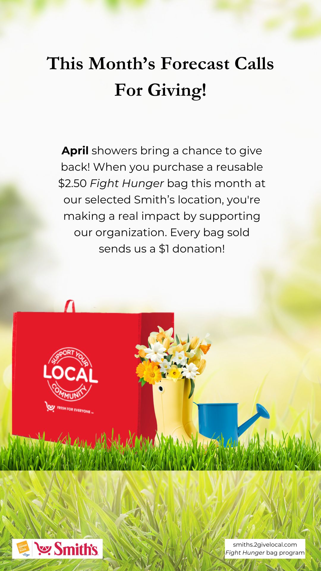 Your selection period for the Fight Hunger bag program is April and May. Use the tools below to let your community know they can support you in April at your selected Smith’s location(s)! We’ll also provide you with a new set of tools for May.