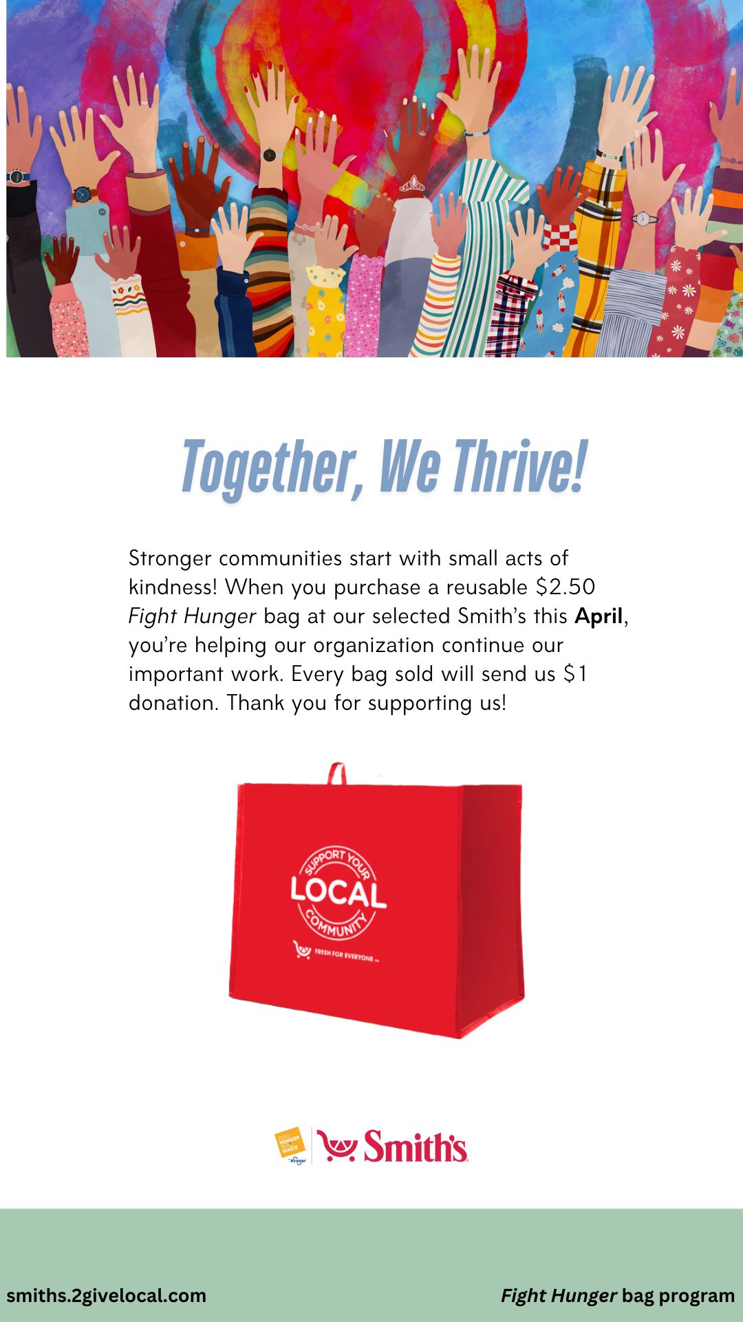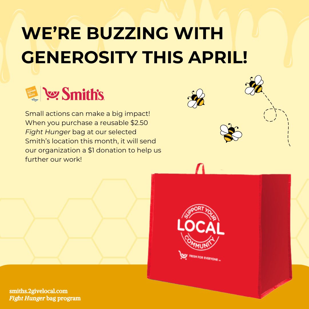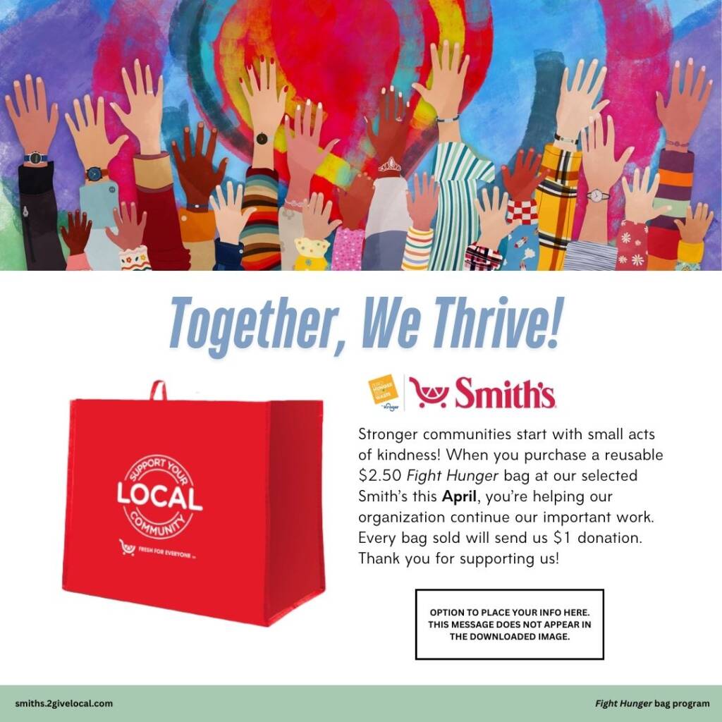 Your selection period for the Fight Hunger bag program is April and May. Use the tools below to let your community know they can support you in April at your selected Smith’s location(s)! We’ll also provide you with a new set of tools for May.